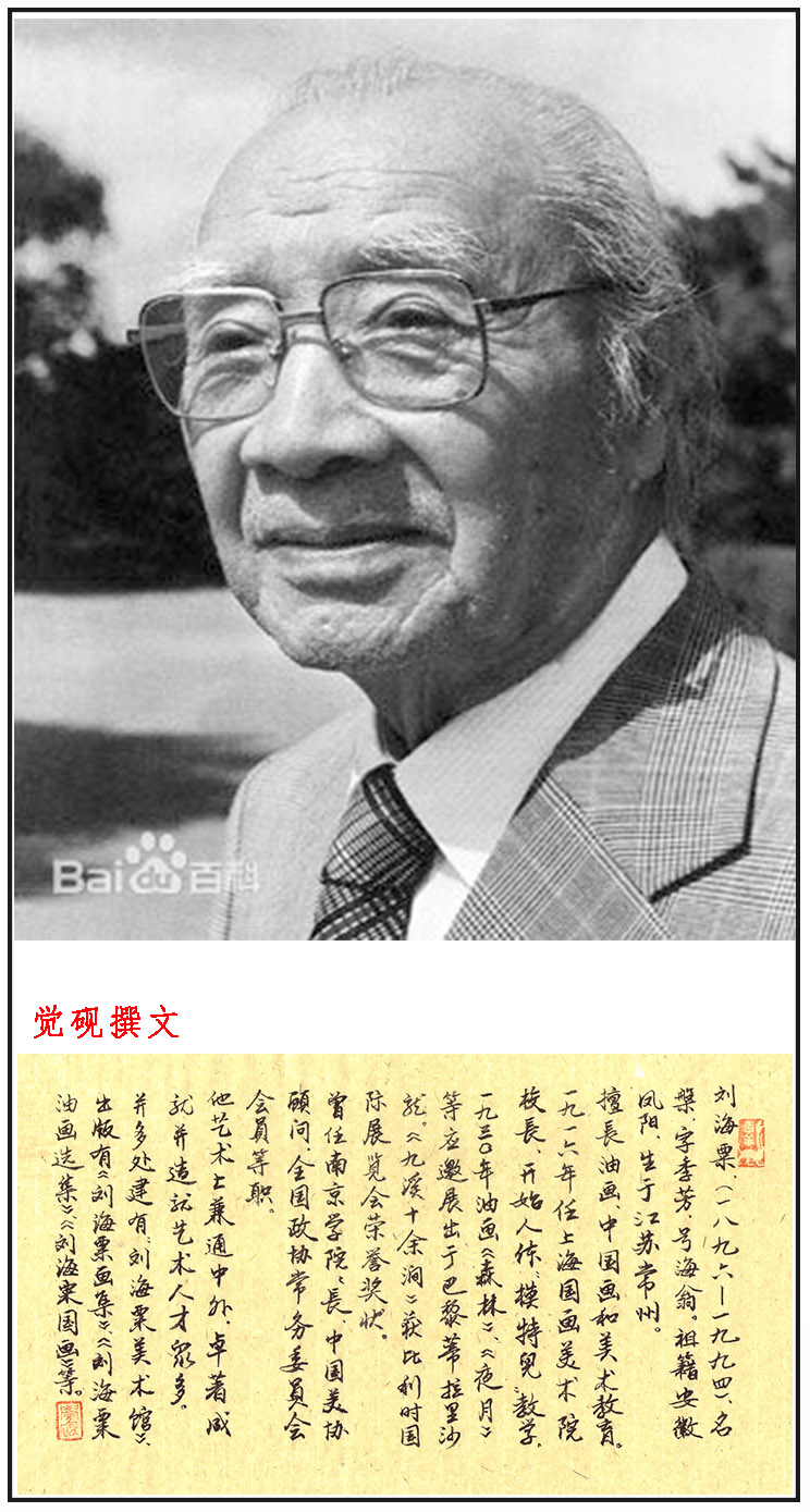 刘海粟(1896-1994),名槃,字季芳,号海翁。汉族,江苏常州人。现代杰出画家、美术教育家。1912年与乌始光、张聿光等创办上海图画美术院,后改为上海美术专科学校,1914年秋始任副校长,1919年7月始任校长。1952年院系调整后任华东艺术专科学校校长、南京艺术学院院长。早年习油画,苍古沉雄。兼作国画,线条有钢筋铁骨之力。后潜心于泼墨法,笔飞墨舞,气魄过人。晚年运用泼彩法,色彩绚丽,气格雄浑。历任南京艺术学院名誉院长、教授,上海美术家协会名誉主席。中国美术家协会顾问。英国剑桥国际传记中心授予“杰出成就奖”。意大利欧洲学院授予“欧洲棕榈金奖”。