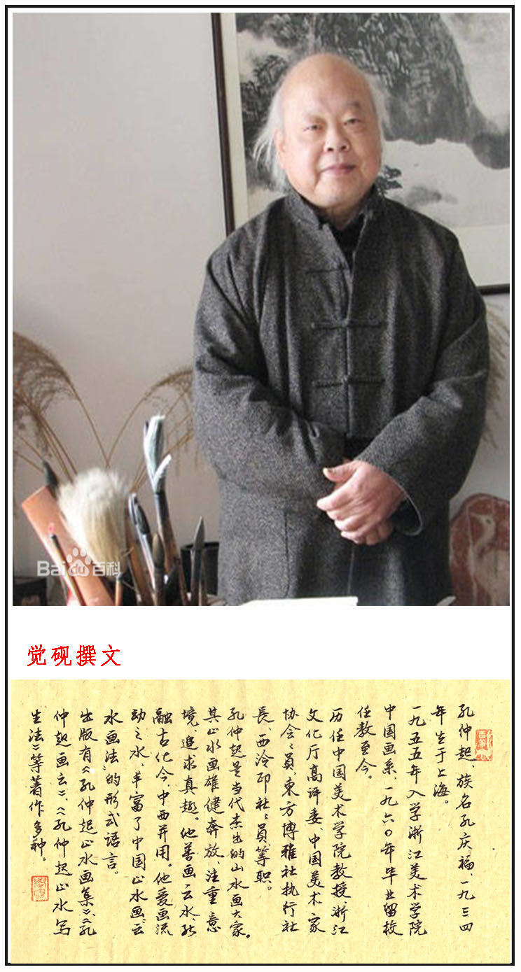孔仲起,名庆福,字仲起。原籍浙江慈溪,1934年出生于上海的一个绘画世家,祖父子瑜、父小瑜、兄伯容均擅长花鸟博古画,有名于时。孔仲起少年学画,后因家境不济,14岁辍学,17岁入上海英雄金笔厂当工人,其间发奋自学,业余积极参加美术活动。1955年入学浙江美术学院中国画系,1960年毕业后留校任教。历为中国美术学院教授、学位委员、浙江省文化厅高评委、中国美术家协会会员、东方博雅社执行社长、西泠印社社员、联合国国际美育学会理事,享受国务院特殊津贴。