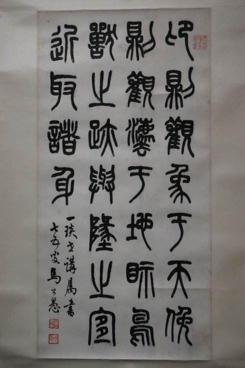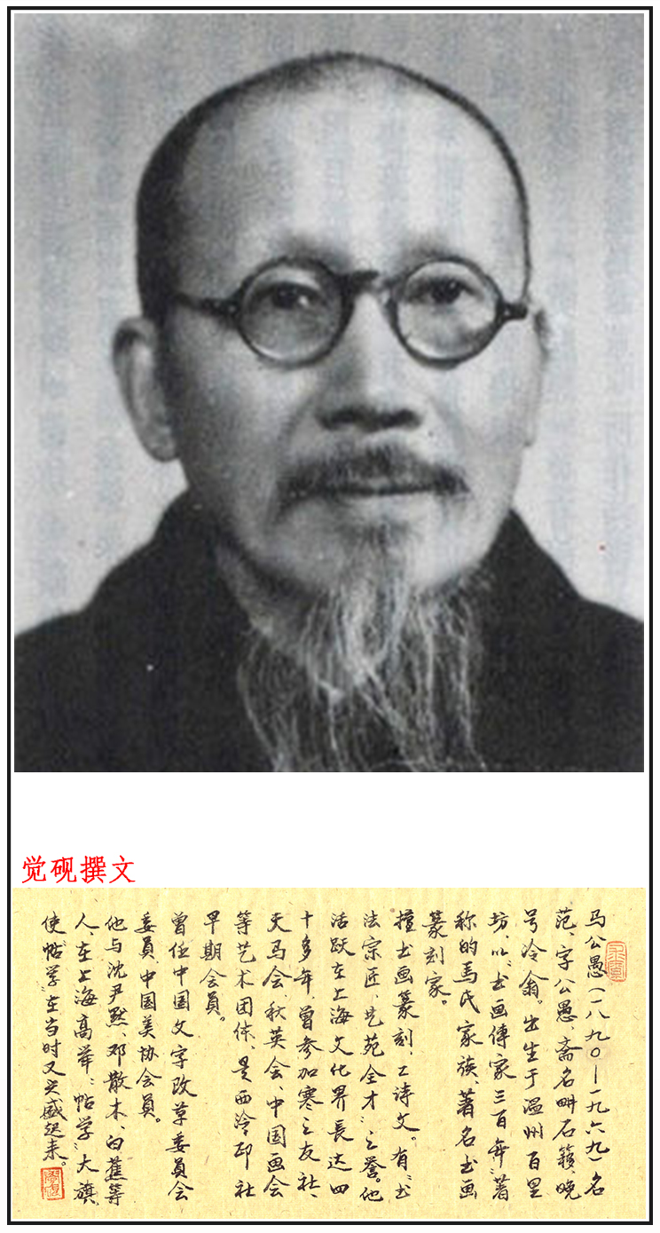 马公愚(1890-1969),本名范,初字公驭,后改公禺、公愚,晚号冷翁,因其斋名“畊石簃”,故又署畊石簃主,永嘉城区(今温州鹿城区)百里坊人。永嘉马氏,自清以来,以诗文、金石、书画传家凡二百年。曾祖昱中(解元出身)、祖父兰生(名元熙),均工诗文书画。公愚幼承家学,稍长曾师承瑞安孙诒让、究心周鼎秦权、石刻奇字。后与兄孟容就读温州府中学堂。